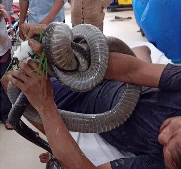 Hiện, anh được chuyển đến điều trị tại Bệnh viện Chợ Rẫy (TP.HCM). Con rắn cắn nạn nhân được xác định là rắn hổ mang chúa dài khoảng 3 mét, nặng 4,5kg.