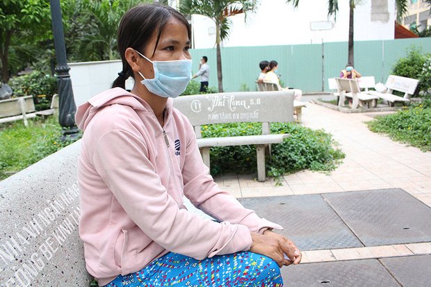 Bùi Thị Ngọc Tuổi chờ đợi bên ngoài phòng điều trị của chồng tại Bệnh viện Chợ Rẫy. Ảnh: **********
