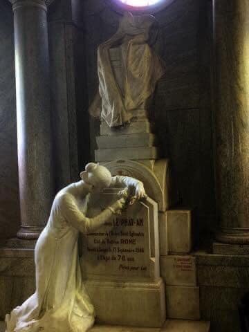 Từ ngoài vào, phía bên trái là bức tượng người phụ nữ quỳ trên gối, hai tay cầm 2 bó hoa huệ ôm choàng lấy tấm bia mộ. Đầu bà để trần, tóc búi cao, đầu hơi chếch hướng vào ngôi mộ phía sau.
