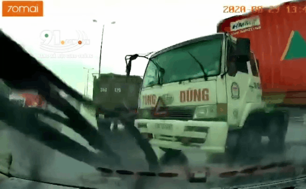Đoạn clip ghi lại khoảnh khắc nguy hiểm trên QL5, khu vực gần cầu Lai Vu, huyện Nam Sách, Hải Dương. Camera hành trình của một chiếc xe gần đó ghi lại diễn biến vụ việc.