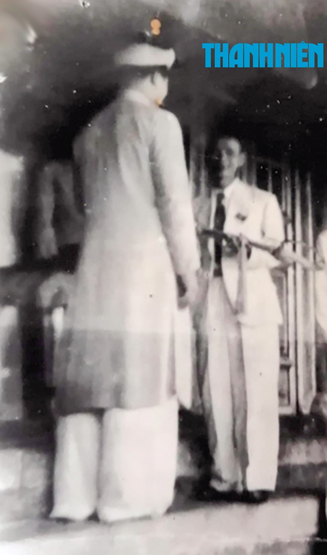 Trưởng đoàn Trần Huy Liệu (phải) nhận thanh kiếm nạm ngọc từ vua Bảo Đại thoái vị, chiều 30.8.1945 Ảnh: Tư liệu sưu tầm từ Lưu trữ Cộng hòa Pháp