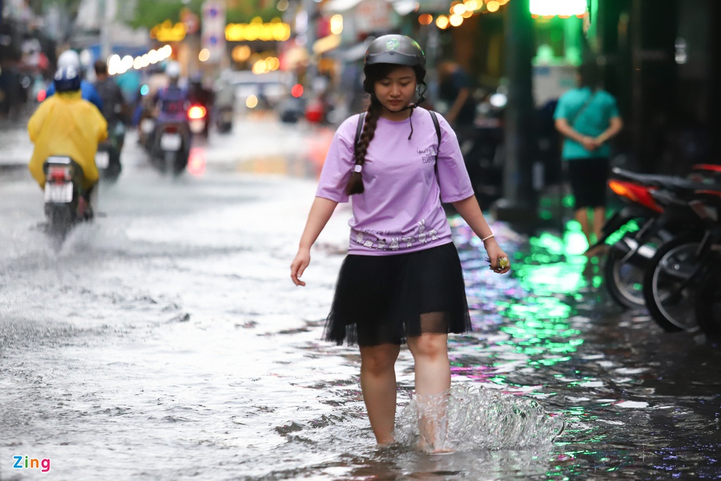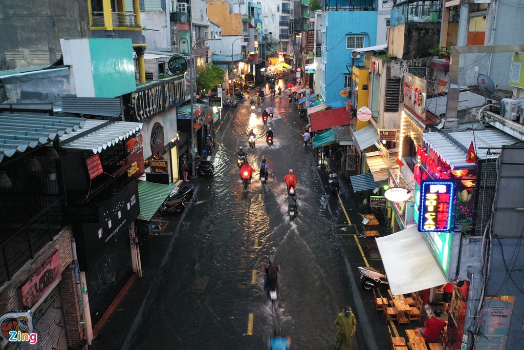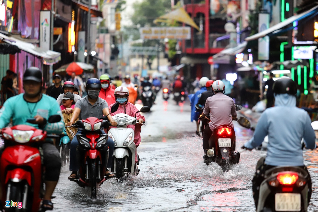 Phố đi bộ Bùi Viện ngập nước sau mưa lớn. Mưa lớn chiếu qua 24/9 khiến phố đi bộ Bùi Viện (quận 1, TP.HCM) ngập nhiều giờ, người dân vất vả lội nước về nhà.