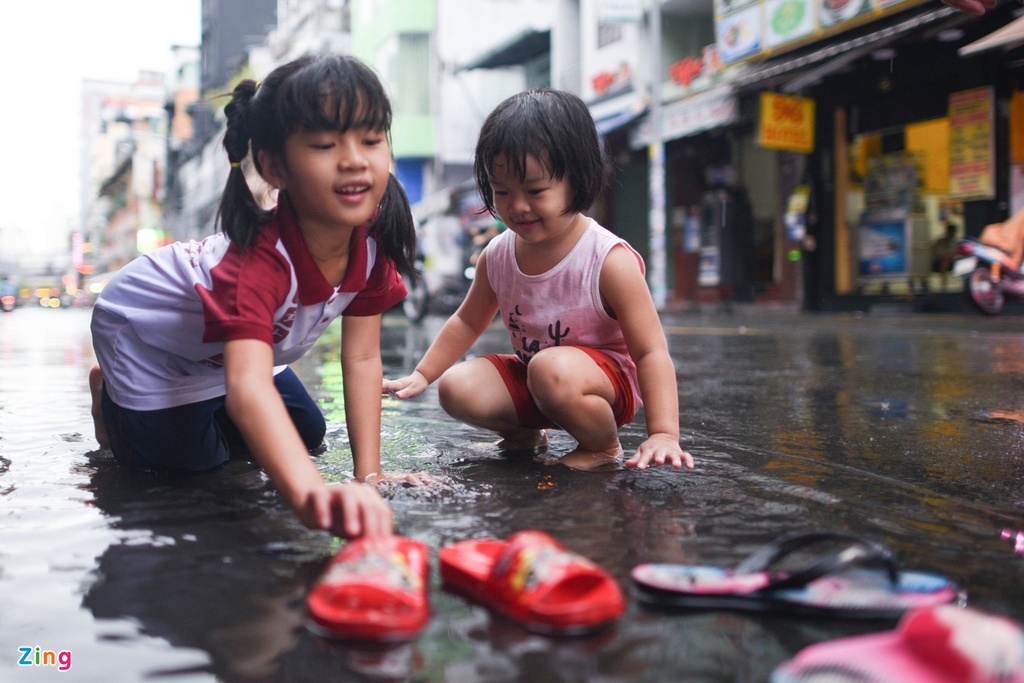 Trẻ em sinh sống gần đây thích thú chơi đùa với dòng nước ngập ngay giữa phố.