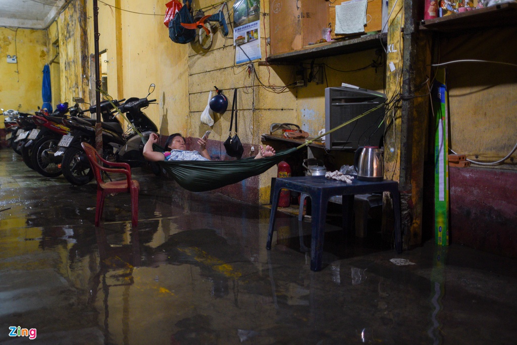 18h, mưa đã tạnh khá lâu nhưng nước vẫn lênh láng bên trong một hầm gửi xe.
