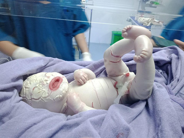 Một em bé được sinh non trong tình trạng toàn thân bị bao phủ bởi một lớp cứng. Theo các bác sĩ, em bé mắc phải bệnh bẩm sinh di truyền. Những lớp da này khô và khiến em bé đau đớn vì nứt nẻ.