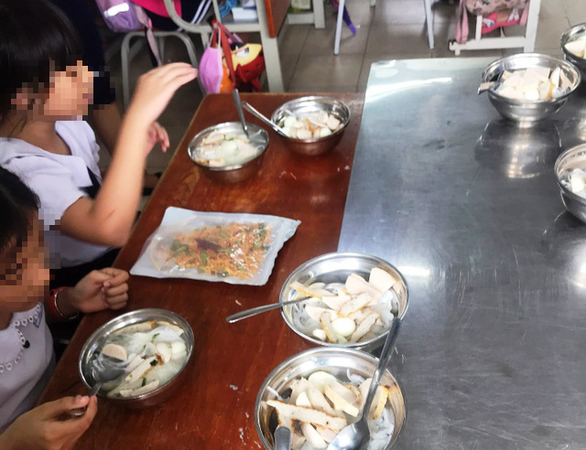 Kiểm tra suất ăn bán trú của học sinh vào trưa cùng ngày, phụ huynh thấy mỗi suất ăn chỉ có cơm với hai miếng trứng rán có trộn thịt heo và canh.