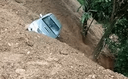 Chiếc xe bán tải cứ thế từ từ bị đất sạt lở cuốn đi trước sự kinh hãi của nhiều người.