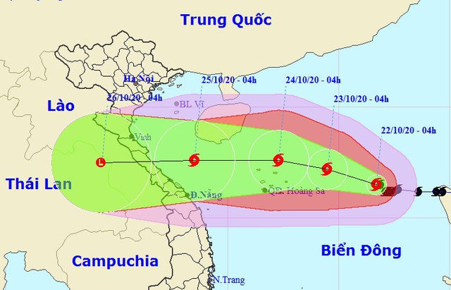 Theo Trung tâm Dự báo khí tượng thủy văn Quốc gia, hồi 4h ngày (22/10), vị trí tâm bão ở khoảng 16,5 độ Vĩ Bắc; 116,7 độ Kinh Đông, cách Quần đảo Hoàng Sa khoảng 470km về phía Đông. Sức gió mạnh nhất vùng gần tâm bão mạnh cấp 10 (90-100km/giờ), giật cấp 13. Bán kính gió mạnh từ cấp 6, giật từ cấp 8 trở lên khoảng 150km tính từ tâm bão.