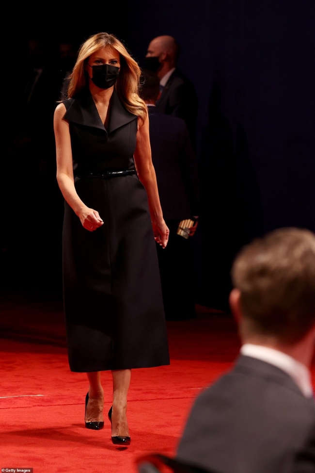 Đệ nhất phu nhân Melania Trump đến cuộc tranh luận tổng thống cuối cùng trong trang phục đen, cùng tông với chiếc khẩu trang. Ảnh: Getty