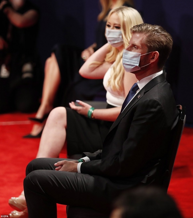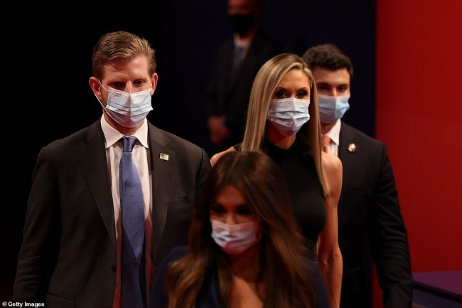 Hầu hết các thành viên trong gia đình Tổng thống Trump bước vào cuộc tranh luận đầu tiên và đeo khẩu trang, nhưng đã tháo ra sau khi về chỗ ngồi. Bà Melania bỏ khẩu trang sau khi rời khỏi chỗ ngồi lúc gần cuối tranh luận để lên sân khấu cùng chống. Trong khi đó, ông Joe Biden và vợ vẫn còn đeo khẩu trang.