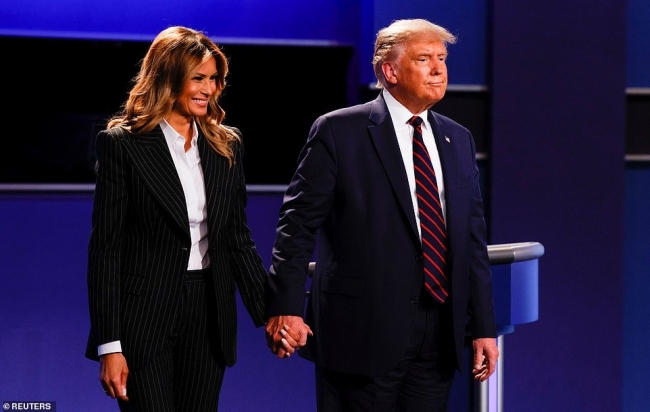 Melania bỏ khẩu trang khi ròi chỗ ngồi và lên sân khấu với chồng vào cuối buổi tranh luận. Ảnh: Reuters