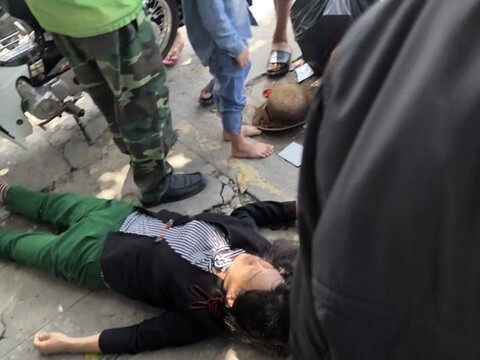 Trong khi cùng con nhỏ đón xe ôm, người phụ nữ bị hai tên cướp áp sát giật túi xách, cố gắng giằng co rồi bị ngã xuống đường trọng thương, hai tên cướp cũng bị ngã nên hốt hoảng bỏ xe tháo chạy.