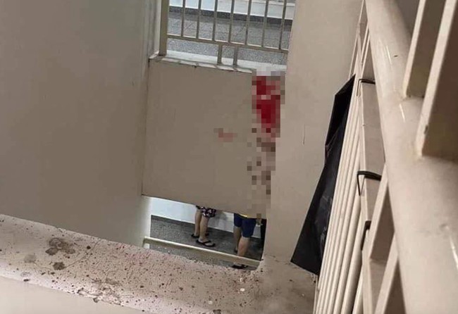 Người chứng kiến không khỏi kinh hoàng khi nhìn thấy tại hiện trường, đầu và thân của thi thể nằm tách rời ở giếng trời chung cư trong khi một phần bức tường bị dính máu.