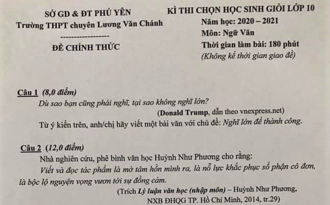 "Dù sao bạn cũng phải nghĩ, tại sao không nghĩ lớn?" là câu nói được đưa vào đề thi chọn học sinh giỏi Văn lớp 10 của trường chuyên Lương Văn Chánh - Phú Yên. Chia sẻ với ****, thầy Hồ Tấn Nguyên Minh, giáo viên Ngữ văn trường THPT chuyên Lương Văn Chánh (Phú Yên) cũng là người ra đề cho biết, đây là một câu trong cuốn sách của Trump có nhan đề "Nghĩ lớn để thành công".