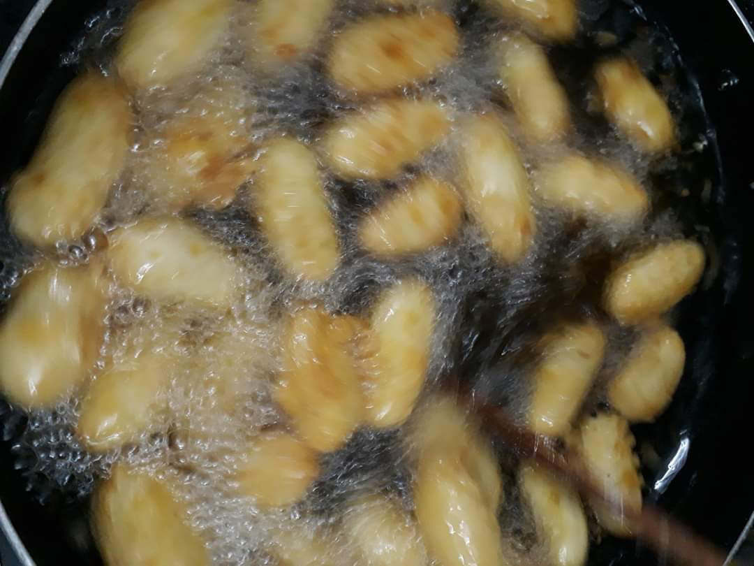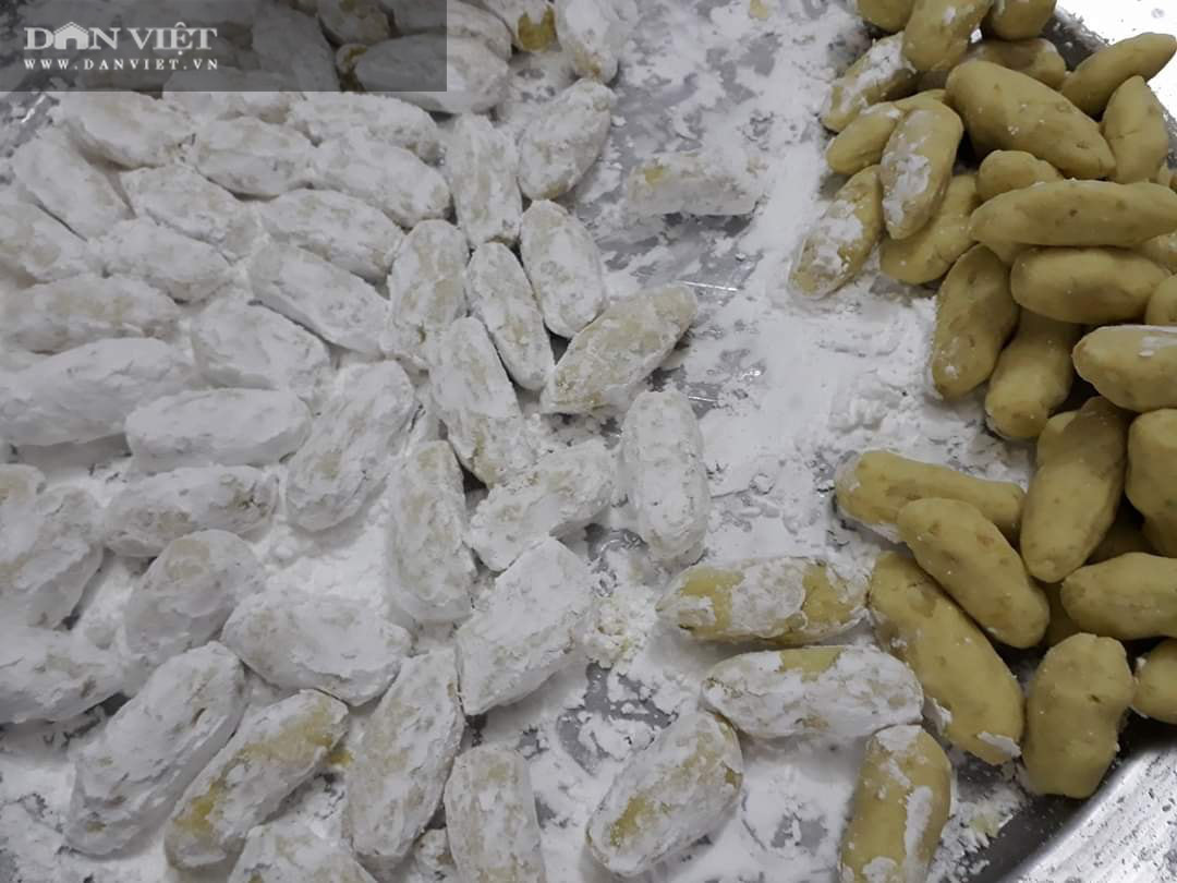 - Nặn khoai thành hình dài hoặc tròn . Lăn khoai qua bát đựng bột năng còn lại