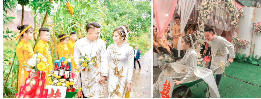 Cô dâu Quỳnh Duyên cho biết: "Nhà mình và chồng cách nhau chỉ 300 m. Trước đám hỏi, anh ấy nói rằng sẽ dùng xe rùa đưa tráp sang nhưng mình không tin. Đến ngày, mình rất bất ngờ. Gia đình mình ai cũng ngạc nhiên và bật cười".