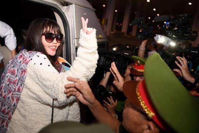 “Cảm xúc của chị thế nào khi trở về cố hương sau hơn 2 năm đi tù?” – phóng viên của báo Dantrithap.com cố chen được vào và đặt câu hỏi. “Tôi rất vui và tự hào! – nữ minh tinh giọng nghẹn ngào – Hai năm đi tù vừa rồi là một bước đệm tuyệt vời cho sự nghiệp của tôi. Ngày mai, tôi sẽ có buổi giao lưu với các bạn trẻ để chia sẻ về kinh nghiệm đi tù cũng như bí quyết để thành công sau khi ra tù. Buổi giao lưu sẽ được livestream trực tiếp trên kênh Youtube của tôi, các bạn nhớ like và subscribe kênh nhé!”. “Chị có thể cho biết lý do vì sao đang là ban đêm và trời thì rất nóng mà chị lại đeo kính “dâm” to như cái xu chiêng ốp lên mặt và quàng cái áo lông như cái chăn bông thế này không?” – tới lượt phóng viên báo Nguoiduatinvit.net nhoi được lên và đặt câu hỏi. “À, đây là phục trang của bộ phim “Con điên” mà tôi chuẩn bị tham gia vai nữ chính”…