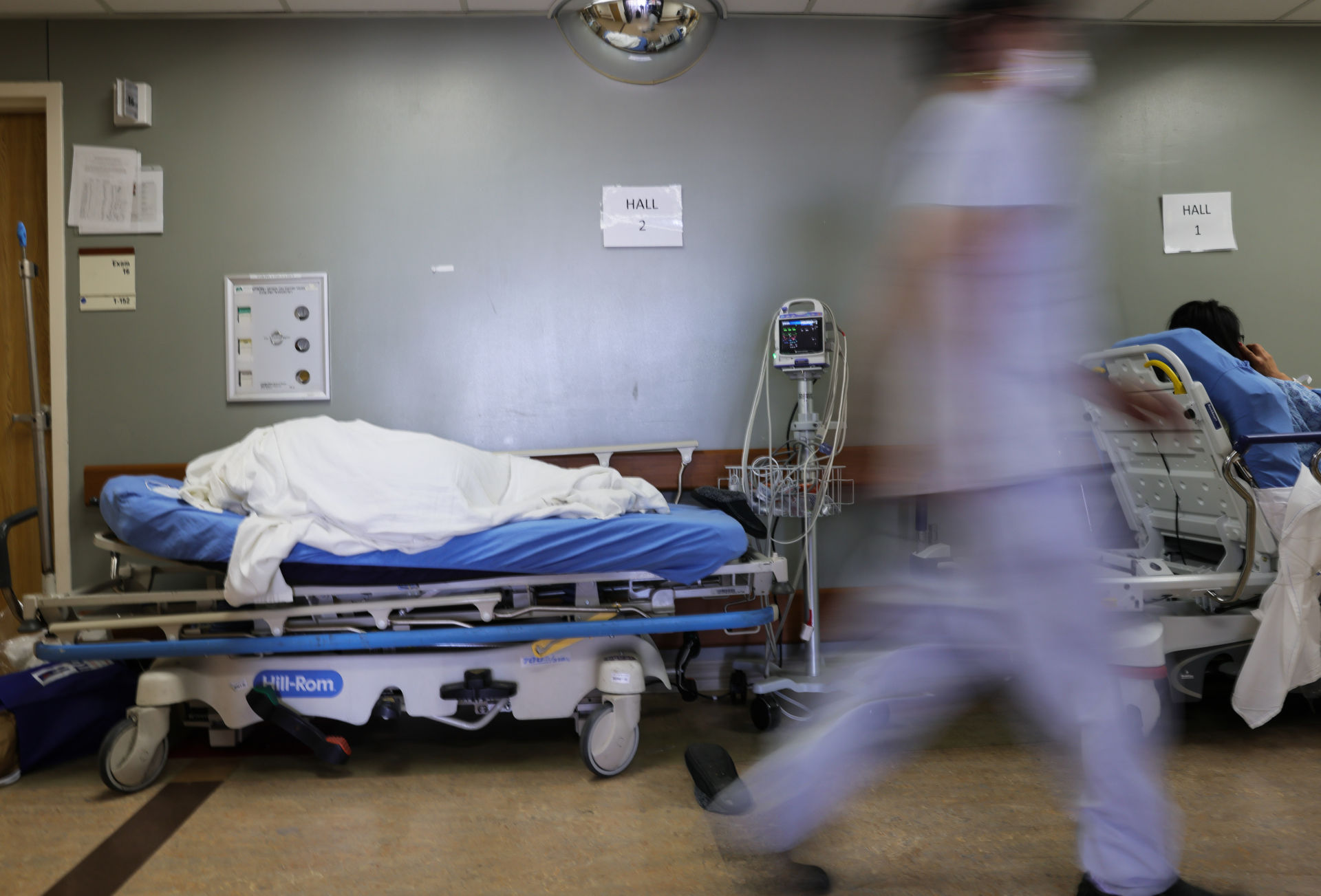 Y tá vội vã bước qua các giường người sống lẫn người chết nằm trên hành lang bệnh viện Providence St. Mary Medical Center. (Hình: Mario Tama/Getty Images)