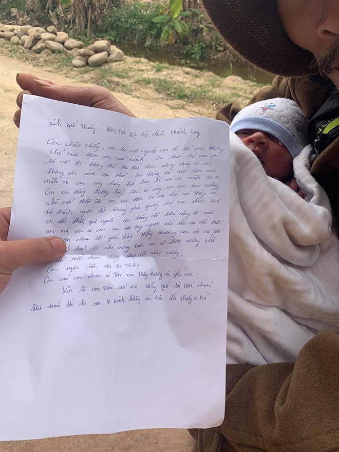 Khi lại gần, mọi người thấy một chiếc làn nhựa bên trong có một bé trai mới sinh kèm vài bộ quần áo cùng lá thư tay với nội dung: