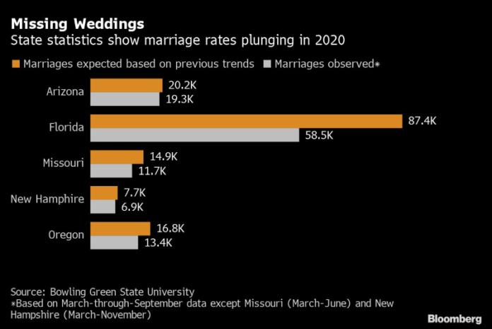 Tình trạng khan hiếm đám cưới và ly hôn vào tháng 3 và tháng 4 năm 2020 có lẽ là điều không thể tránh khỏi. Các văn phòng chính phủ bị đóng cửa và người Mỹ được yêu cầu ở nhà. Tuy nhiên, dữ liệu không cho thấy sự phục hồi lớn vào mùa hè và mùa thu – khi các bang chủ yếu mở cửa trở lại
