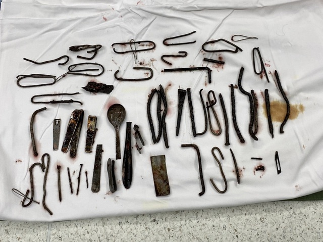Một người đàn ông ở Bình Dương phải nhập viện cấp cứu. Các bác sĩ đã lấy ra từ dạ dày bệnh nhân khoảng 1kg sắt thép với đủ các loại vật dụng. Té ra ông này có sở thích ăn các vật kim loại.