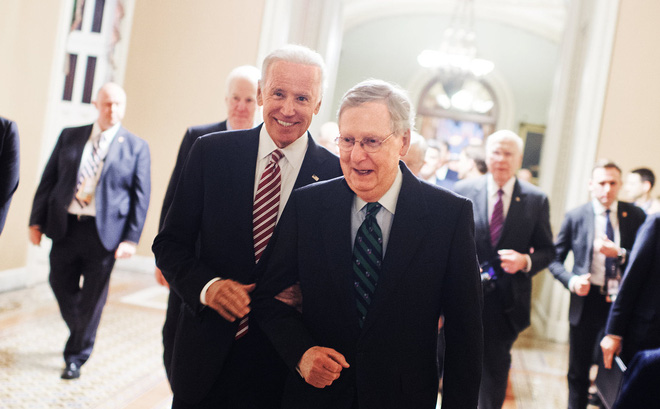 Ông Joe Biden (trái) và ông ông Mitch McConnell đến dự buổi đọc Thông điệp Liên bang của Tổng thống Barack Obama, ngày 12/1/2016 (Ảnh: Getty Images)
