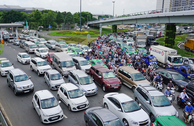 Kẹt xe trên đường Trường Sơn, đoạn trước cổng sân bay dịp Tết Nguyên đán 2020. Ảnh: Gia Minh.