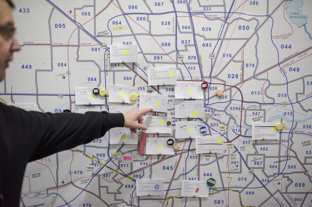 Nhân viên Rickey Tyler của dịch vụ sửa ống nước OneCall Plumbing với bản đồ cùng ghi chú yêu cầu của khách hàng ở Houston, Texas. Ảnh: New York Times.