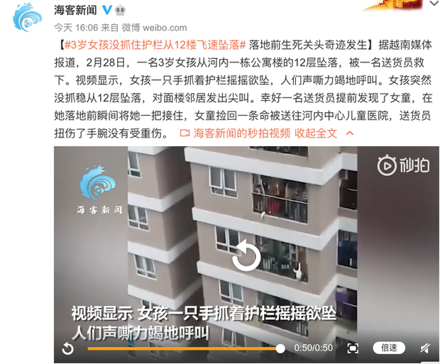 Vào khoảng 16 giờ (giờ địa phương), trên trang Weibo chính thức của báo Hải Khách thuộc Nhật Báo Nhân Dân (Trung Quốc) đã đưa tin về vụ việc bé gái 3 tuổi thoát chết thần kỳ khi rơi từ tầng 12 nhờ sự dũng cảm của một người đàn ông ra tay cứu giúp. Tiêu đề của bài đăng có ghi: "Bé gái 3 tuổi đang nắm lấy lan can rơi nhanh từ tầng 12, điều kỳ diệu đã xảy ra trước khi đáp đất".