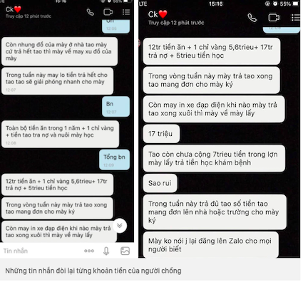 Ngoài tiền ăn, P.H cũng cần thanh toán cho chồng các khoản khác như: tiền khám sức khỏe sinh sản, tiền học phí, tiền đám cưới và cả 1 chỉ vàng mà mẹ chồng từng cho P.H hồi đám cưới. Tổng cộng số tiền lên tới 42,6 triệu đồng.
