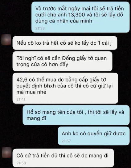 P.H đã xin chồng thư thả và trả trước một khoản. Tuy nhiên, anh chồng không đồng ý mà đáp lại bằng những lời gay gắt, đại loại như: "Nếu cô không trả hết cô sẽ không lấy được một cái gì. Tôi nghĩ cô sẽ cần đống giấy tờ quan trọng của cô hơn đấy".