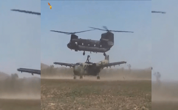 Trong đoạn clip dài hơn 5 phút được đăng tải trên mạng xã hội Facebook, trực thăng vận tải CH-47 Chinook lơ lửng trên không trung trong khi chờ móc dây cáp nối liền với một chiếc máy bay lớn nằm dưới mặt đất. Sau khi mọi thủ tục đã hoàn tất, siêu trực thăng vận tải từ từ bay lên kéo theo một chiếc máy bay lớn.