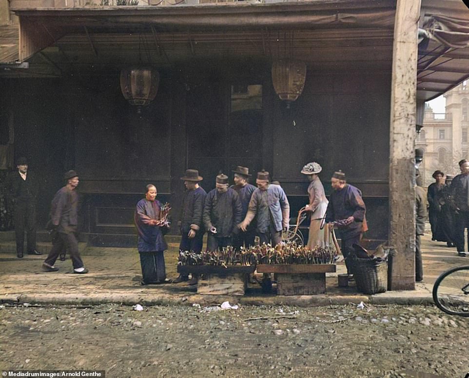 Những người đàn ông Trung Quốc đứng mua hoa ở khu phố người Hoa tại San Francisco, Mỹ. Ảnh: Arnold Genthe