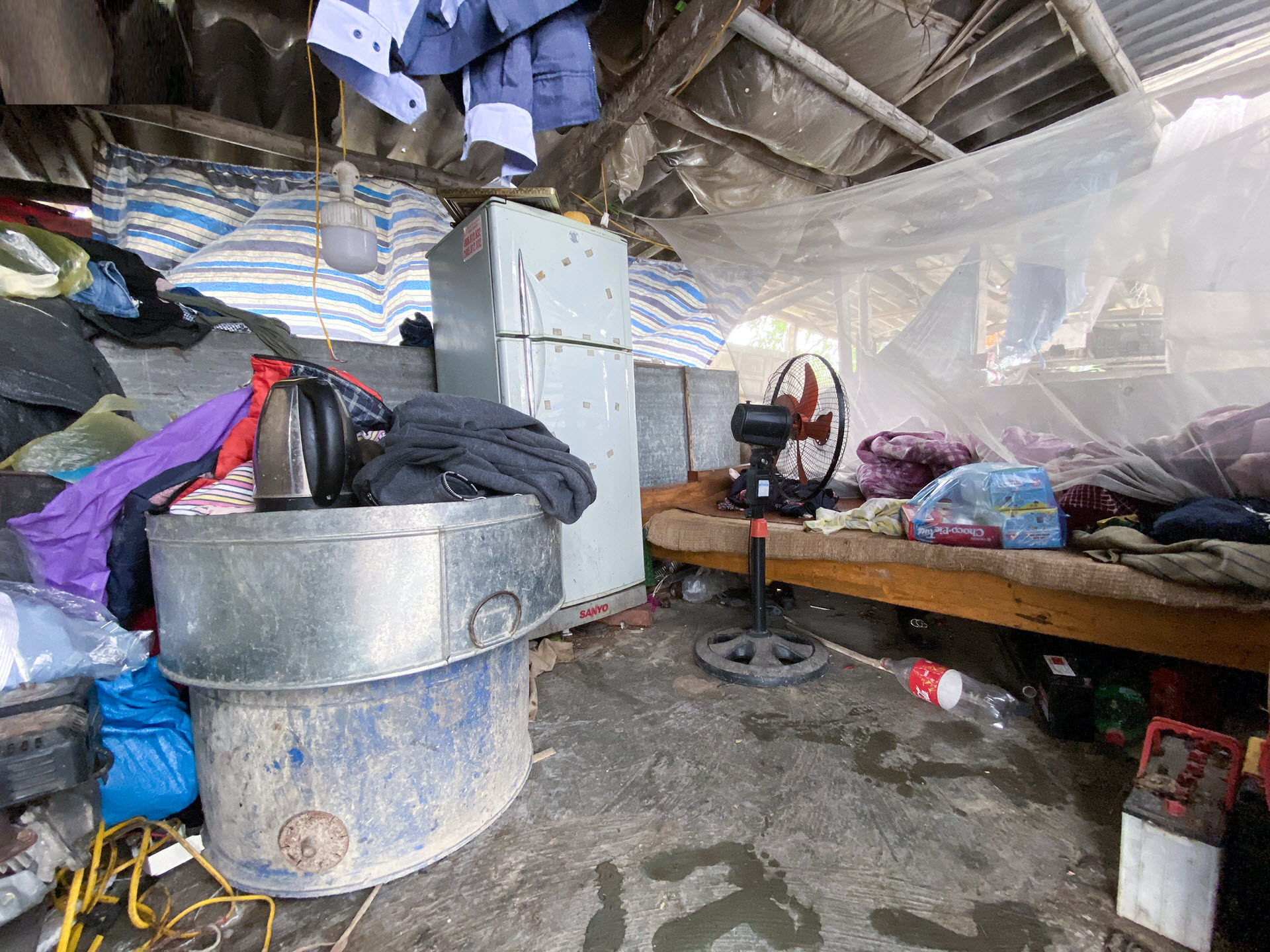 Căn phòng rộng chừng 15m2, bên trong đặt vừa chiếc giường, quạt và cái tủ lạnh cũ, mỗi lần trời trở gió miếng vải bạt bập bùng như muốn rách toác, ngồi trong nhà mà gió lùa như bên ngoài, lạnh đến cắt da cắt thịt.