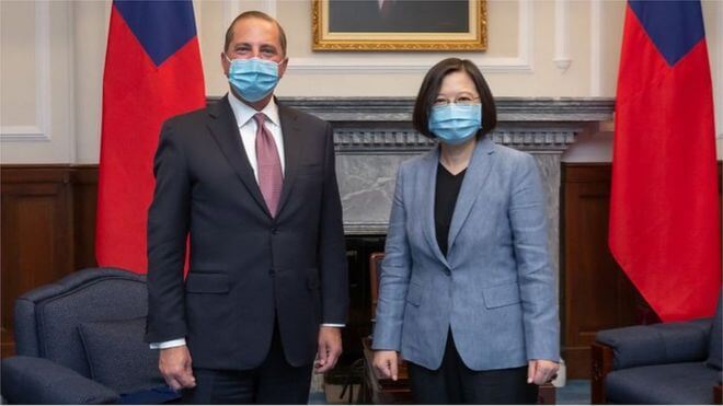 Ông Alex Azar (trái), Bộ trưởng Y tế và Dịch vụ Nhân sinh Mỹ dưới thời Tổng thống Donald Trump gặp lãnh đạo Đài Loan Hứa Anh Văn hôm 10/8/2020 tại Đài Bắc. Ảnh: BBC