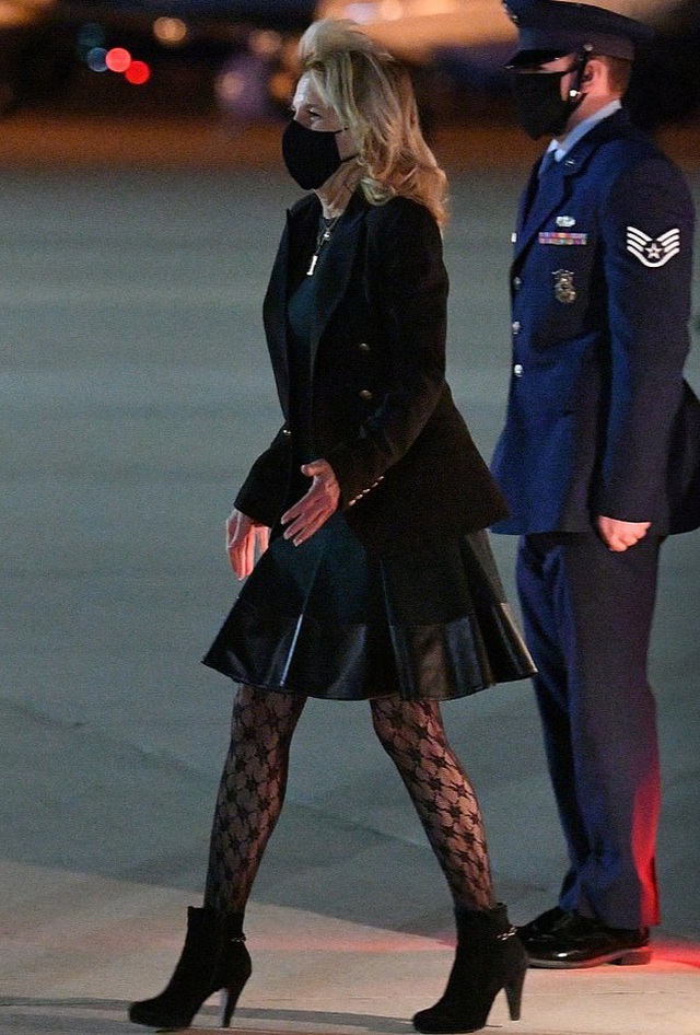 Bà Biden, 69 tuổi, mặc quần tất hoa văn khi di chuyển về căn cứ quân sự Andrews ở Maryland trên chuyên cơ Không lực Một hôm 1/4. Các bức ảnh chụp cho thấy bà mặc áo khoác đen, váy đen dài trên đầu gối, bốt cao gót đen và quần tất màu đen có họa tiết đan chéo.