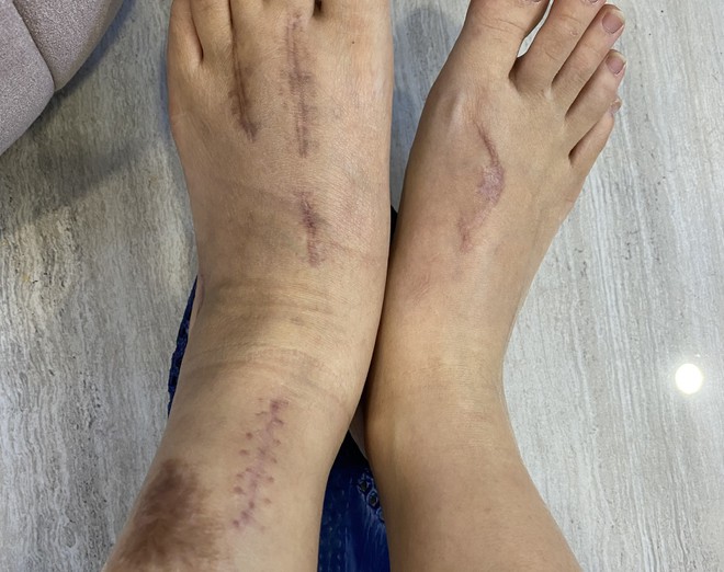 Bà Anh nói bà vẫn còn ám ảnh hôm con vừa nhập viện, xương gãy sưng to, đen xì khiến cả bác sĩ nhìn còn thấy sợ. Lần ấy, nữ tiếp viên phải tiêm kháng viêm liều cao và được bác sĩ vệ sinh tỉ mỉ mới dần hồi phục lại.