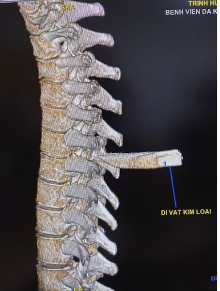 Nam thanh niên 30 tuổi bị dao đâm vào cột sống. Khiến phải mang cả mũi dao cắm sâu vào lưng đến bệnh viện cấp cứu. Các bác sĩ đã phải nhanh chóng lấy mũi dao ra khỏi người bệnh nhân.