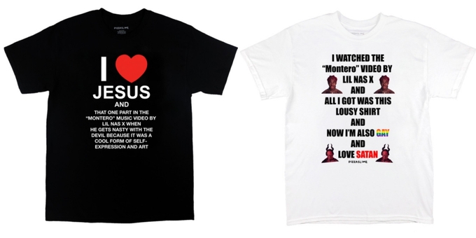 Rapper Lil Nas X hợp tác với thương hiệu Pizzaslime sản xuất áo phông, ra mắt hôm 16/4 với giá 33 USD. Bộ sưu tập gồm hai mẫu áo đen và trắng, trong đó áo đen in dòng chữ "I love Jesus" (Tôi yêu chúa Jesus), áo trắng mang thông điệp "Tôi là người đồng tính và yêu quỷ Satan". Sản phẩm nhằm quảng bá MV "Montero" mới phát hành của Lil Nas X.