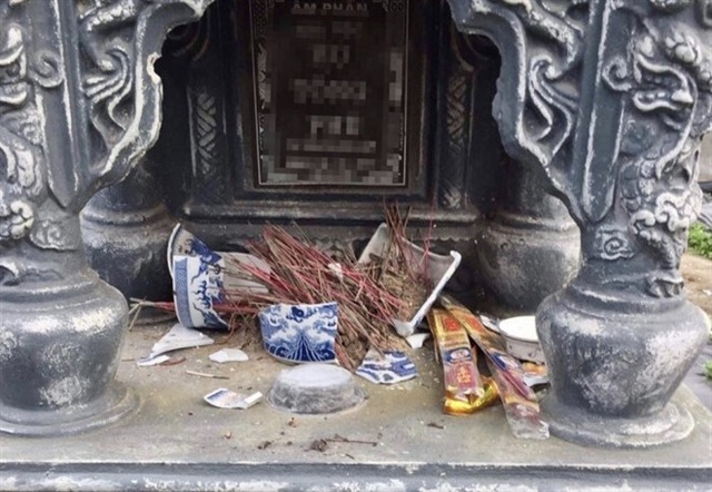 Cụ thể, một số bát hương, lọ hoa, phần hoa văn trang trí trên mộ... bị đập vỡ; cây cối xung quanh cũng bị chặt phá không thương tiếc.