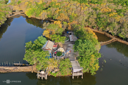 Căn nhà nhỏ rộng 20 m2 của vợ chồng ông Nguyễn Ngọc Đáp (77 tuổi) cùng vợ là bà Trần Thị Hồng (75 tuổi) được bao bọc bởi nước lợ và rừng ngập mặn. 38 năm qua, cư dân nơi đây chỉ có vợ chồng ông Đáp.