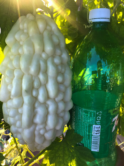 Từ ngày làm vườn, anh Liêm được biết thêm nhiều loại giống cây lạ. Khi thấy có bạn bè trong nhóm trồng rau khoe trái khổ qua trắng, trái cũng rất to nên anh xin hạt giống về trồng. Mỗi trái khổ qua này có thể to bằng một chai nước ngọt loại 1,5 lít.