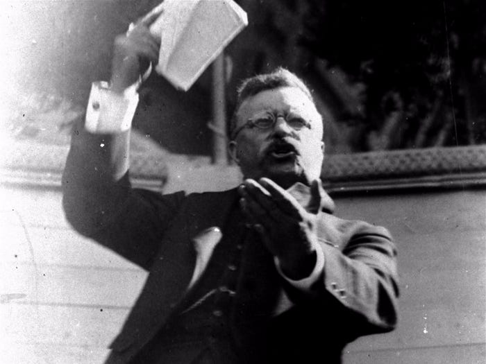 "Này các bạn, tôi cần các bạn giữ trật tự nhất có thể". Câu nói đầu tiên của ông Roosevelt tại buổi diễn thuyết ngày 14/10/1912, gần như không gây được sự chú ý vì nó quá quen thuộc với một bài phát biểu tranh cử tổng thống. Nhưng câu nói sau đó thực sự gây chấn động: "Tôi vừa bị bắn".