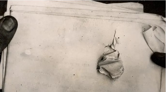 Xấp giấy diễn thuyết mà ông Roosevelt mang trên người có vết đạn thủng sau vụ ám sát. Ảnh: Flickr