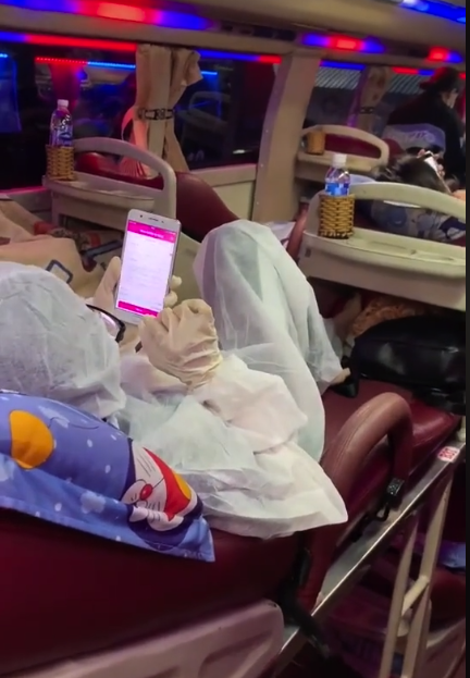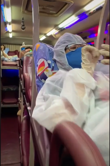 Theo đó, trên TikTok xuất hiện đoạn clip ghi lại cảnh một cô gái đi xe khách, trên người mặc bộ quần áo bảo hộ, đeo khẩu trang và găng tay rất cẩn thận.