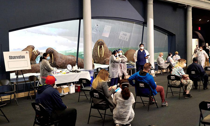 Một điểm tiêm chủng vaccine Covid-19 tại Bảo tàng Lịch sử Tự nhiên Mỹ tại New York hôm 30/4. Ảnh: Bloomberg.