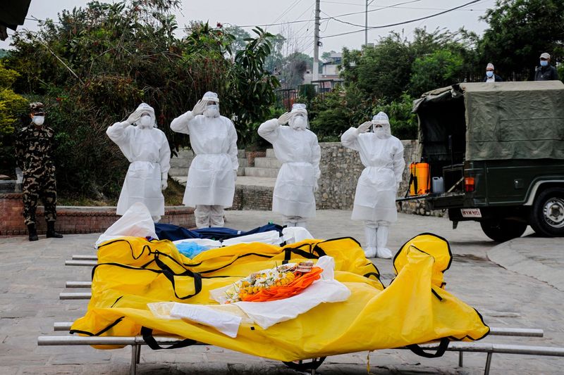 Binh sĩ Nepal "chào tiễn biệt" các nạn nhân tử vong vì Covid-19 ở lò hỏa táng Kathmandu hôm 1/5. Ảnh: Getty