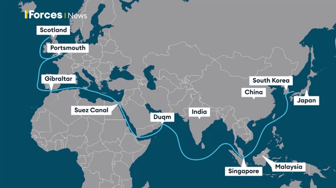Lộ trình dự kiến của nhóm tàu sân bay HMS Queen Elizabeth từ Anh đến châu Á - Thái Bình Dương. Ảnh: Forces News.