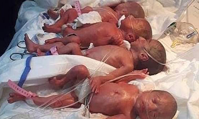 Bốn trong số 9 em bé chào đời hôm 4/5 tại bệnh viện ở Morocco. Ảnh: Facebook/ Buzz2Stars.