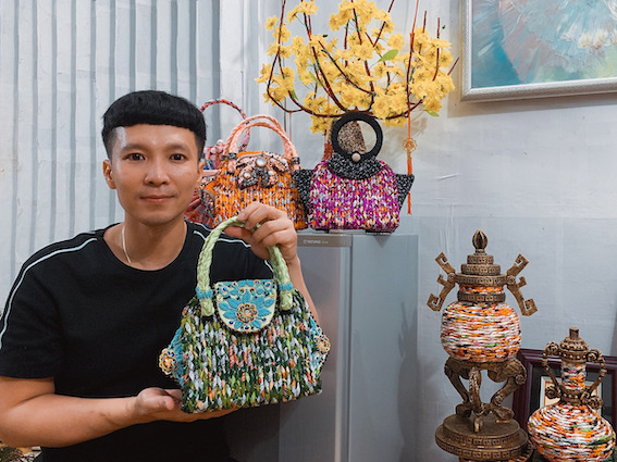 "Tôi cũng từng dùng vỏ bánh snack để se sợi làm túi nhưng vì vỏ bánh dày, quá trình tạo thành sợi mất thời gian và đau tay nên tôi chỉ làm vài chiếc", anh nói.